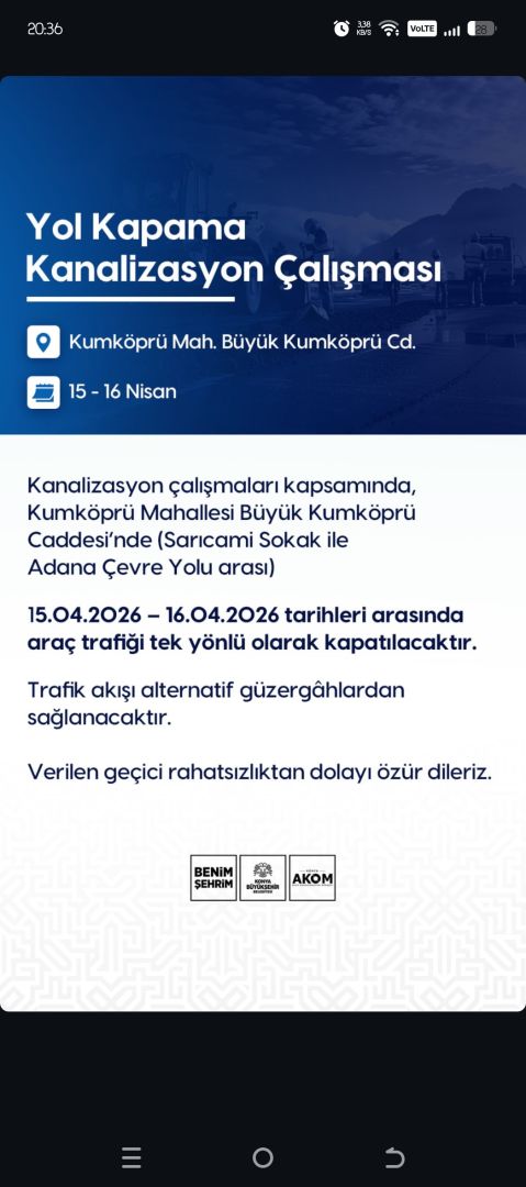 İkinci duyuruda ise kanalizasyon çalışmaları kapsamında Kumköprü Mahallesi Büyük Kumköprü Caddesi’nde (Saricamı Sokak ile Adana Çevre Yolu arası), 15-16 Nisan 2026 tarihleri arasında yolun araç trafiğine tek yönlü olarak kapatılacağı bildirildi.