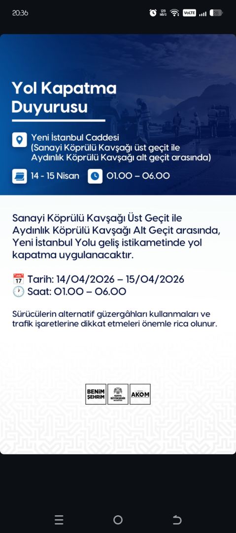İlk duyuruya göre, Yeni İstanbul Caddesi’nde Sanayi Köprülü Kavşağı üst geçidi ile Aydınlık Köprülü Kavşağı alt geçidi arasında, 14-15 Nisan 2026 tarihleri arasında her gece 01.00 ile 06.00 saatleri arasında yol kapatma uygulanacak. Çalışmalar süresince Yeni İstanbul Yolu geliş istikametinde trafik akışı durdurulacak.