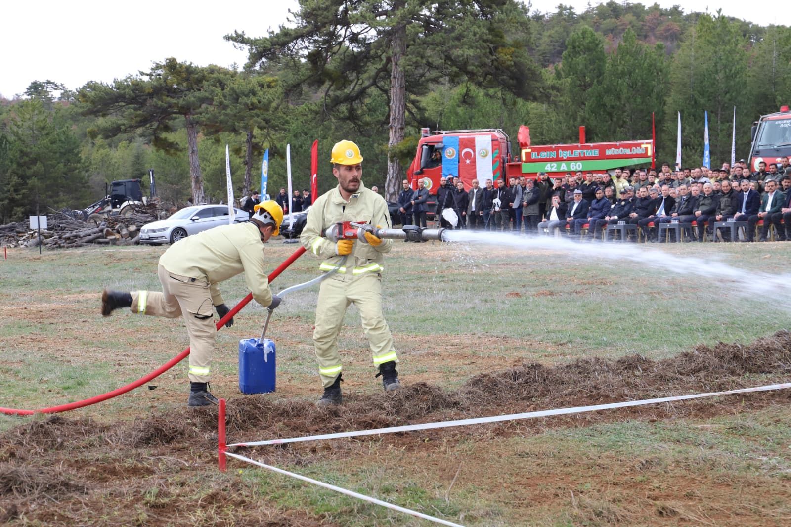 Ilgın Balkı Orman Deposu’nda düzenlenen yarışmada, ekipler çeşitli parkur ve senaryolarda yangına hızlı ve etkili müdahale konularında mücadele etti.