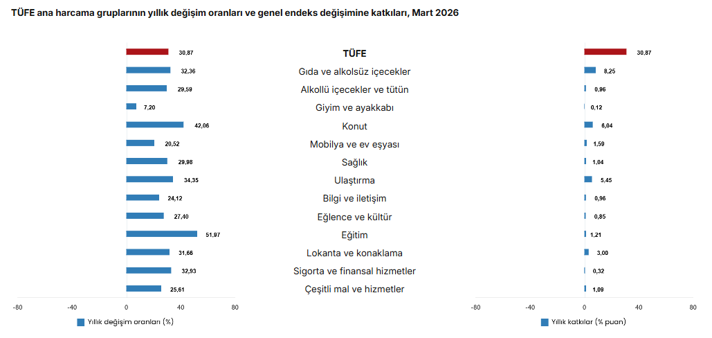 Tüketici fiyat endeksi (TÜFE), Mart 2026’da bir önceki aya göre yüzde 1,94, Aralık 2025’e göre yüzde 10,04, geçen yılın aynı ayına göre yüzde 30,87 ve on iki aylık ortalamalara göre yüzde 32,82 artış gösterdi. Bu veriler, fiyat artışlarının hız kesmeden devam ettiğini ortaya koydu.