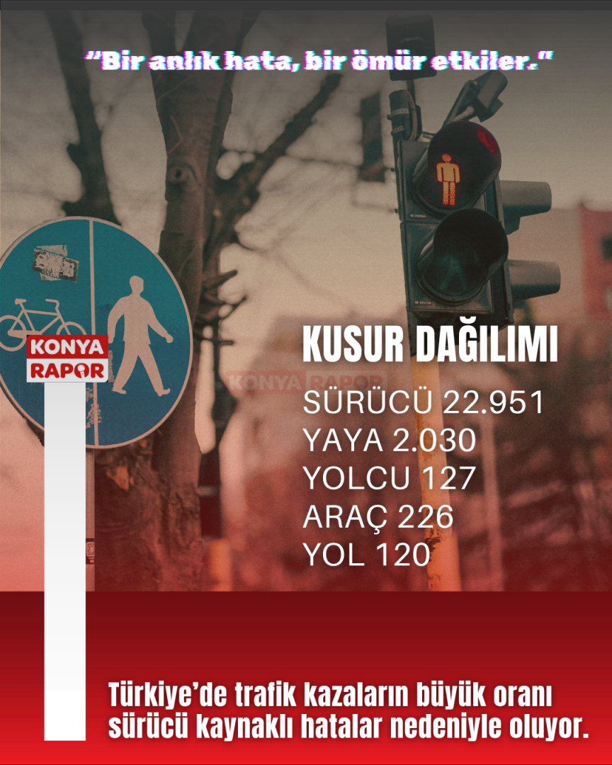 İstatistiklere göre Konya’da da sürücü hataları ülke genelindeki tabloyla paralellik gösterdi. Hız kurallarına uymama ve geçiş önceliği ihlali, kazaların en önemli nedenleri arasında yer aldı.